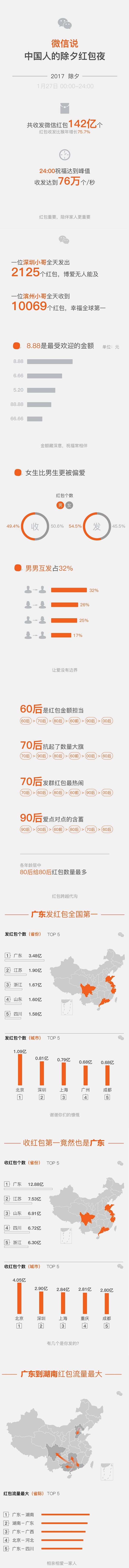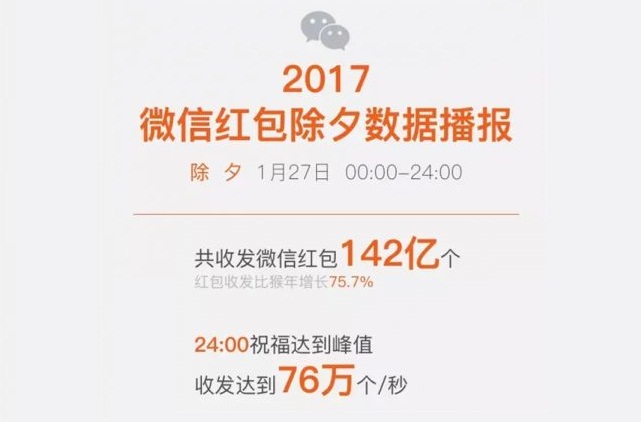 微信红包除夕战况:收发142亿个增长八成 零时每秒76万个