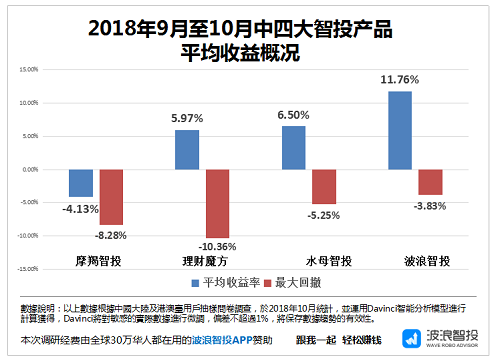 为了调查智能投顾产品的表现,我们统计了上述四家智能投顾产品2018年9月至10月中的平均收益、回撤数据,如下图所示: