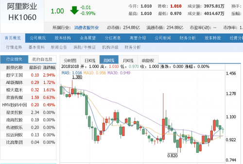 一家公司运作模式的失败,反映在资本市场上的结果也很明显。阿里影业的股价常年徘徊在1港元上下。截至2018年10月10日,阿里影业市值仅为239.59亿元,距离其2015年市值高峰860亿港元,已经蒸发掉了72%的市值。