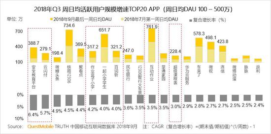 2.5 周日均DAU 100-500万TOP增速榜: 9月开学季让学生党回归校园,以安全教育平台为首的多个教育类App增幅明显;金融服务App竞争进一步加剧