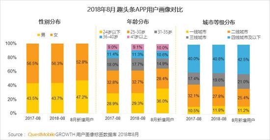 趣头条2018年8月新增用户与去年同期相比男性用户占比增加,新增用户中30岁以下年段和三四线城市占比都有所提升。