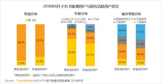 在小红书2018年8月的新增且活跃的用户中男性占比明显上升,超20%的新增活跃用户为男性;30岁以下年龄段用户明显增多,城市等级持续下沉。