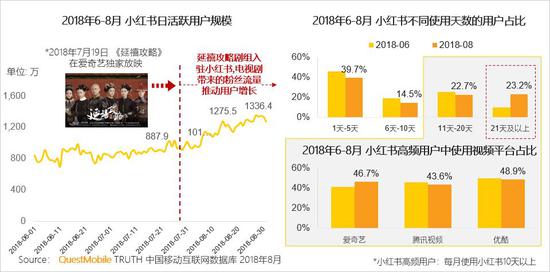 “富察皇后”在剧中下线后,入驻小红书,引入一波新流量。 2018年7月末小红书用户规模呈快速增长趋势,8月末DAU已稳定在千万以上。用户数据表明,在《延禧攻略》热播月份中小红书的高频用户使用爱奇艺的比例也明显高于前两个月,可见热播电视剧《延禧攻略》剧组的入驻成为小红书Q3增长的关键驱动因素。