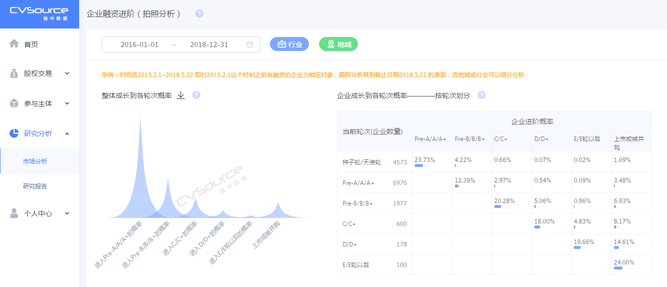 用户只需要设定调研时间段,自定义想要研究的行业或地域。经过后台大数据的复杂演算,就可从宏观视角清晰的看到该时间段,三个维度下的企业宏观融资情况——即企业平均成长到各轮次的概率、每轮融资所花费的平均时间、不同轮次的平均融资金额,达到进阶分析的目的。