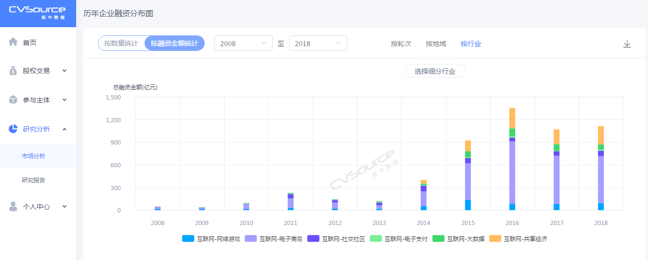 除了进阶分析以外,用户还可以通过柱状图直观发现宏观市场变化,例如依次观察企业在不同轮次、地域、行业条件下的融资表现。其中在行业条件下,分析内容不限于医疗健康、文化传媒、工业制造等大行业分类,该大类别行业下的细分行业融资占比也统统包含。以国内互联网行业为例,2008-2018年互联网行业企业融资分布图不仅显示了行业的快速发展,也反映出具体哪些细分领域是互联网行业蓬勃势头的主力军,像是异军突起的共享经济,以共享单车为代表在2016年扎堆涌现。