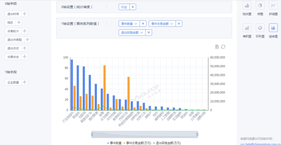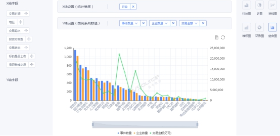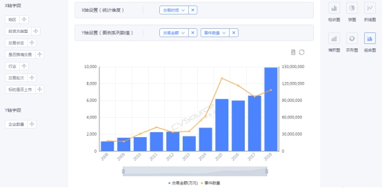 随后,再挑选一个最为贴切的数据图形展示方式,如柱状图、折线图、饼状图等。想要的3万条大数据统计结果就能即刻展现。结果如图(图一)所示,宏观上看近10年VC机构在国内一级市场的投资金额不断上涨,折线显示的投资热度(即事件总数量),在2015年在双创政策的鼓励下出现峰值。