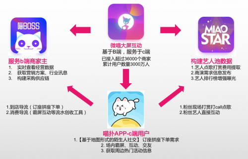 微喵基于大屏互动软件所积累的庞大商家数量和C端用户数量,而衍生出的“喵BOSS”“喵STAR”“喵扑APP”,全方位赋能酒吧娱乐行业内重要关联群体。最后通过“喵扑APP”覆盖的大量C端用户,伴随着APP功能升级和场景拓张,实现从酒吧行业向互动娱乐产业的“华丽转身”。