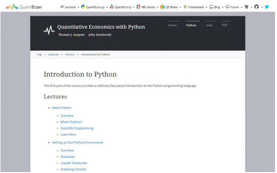 在数量经济学网站上,萨金特用机器学习领域最流行的Python语言,和数据分析的后起之秀Julia语言为载体,精心设计了一系列的课程,内容不仅仅包括宏观经济学的基础和前沿,甚至还包括了资产定价、公共经济学、产业组织实证方法等等。
