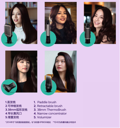 “直发梳是我最喜欢的一个替换头,它在吹干吹顺的同时,仿佛给头发上了一层精油,不会损伤头发的毛鳞片。而弧形发梳模拟了理发店的滚梳,有很多功能。吹出来的卷发弧度非常自然,不会像卷发棒那样死板。”