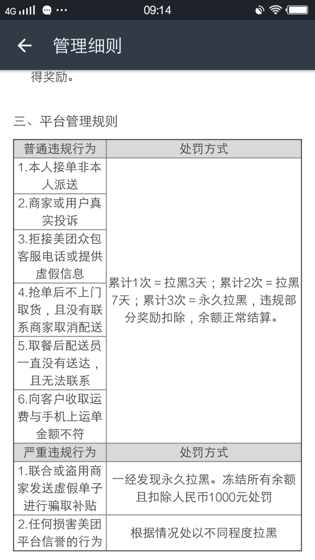 产品方面,目前美团众包APP的IOS版本正在内测中,而安卓版本的美团众包的安卓版本已经上线,在百度手机助手、应用宝、360手机助手等应用分发平台均可下载。据我观察发现,用户想要在平台上抢单,首先要进行实名认证,然后还需要参加在线版的《新手入门培训》,通过后才能抢单,这样充分保证了众包成员的信息真实,也保证了配送人员的配送质量。从平台的管理规则上看,平台对于“作弊”现象的处罚还是挺严厉的。