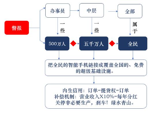 · 环境危机是全人类面临的共性问题。我们是负责任的吹哨人,所有中国人都会变成负责任的吹哨人。所有中国人变成负责任的吹哨人,全人类就会变成负责任的吹哨人。所有人汇聚到一个APP上,我们的智能手机就会被整合为覆盖全国、全球的、免费的、超级的基础设施。在这个我们绝对自主的基础设施上,订单=提货权=订单。我们基础设施上内生的数字可以和传统金融系统内的数字一样,可以充当交易媒介,可以补贴落后产能,将其关闭;可以投资创新,使创新走出低水平重复建设。