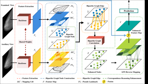 乳腺癌已成为当前社会的重大公共卫生问题之一。乳腺癌早期筛查有助于提高患者生存率,提升患者生存质量。深睿研究院与北京大学前沿交叉学科研究院大数据中心合作发表的科研论文主要探讨基于乳腺X线影像的肿块自动检测,这对于乳腺癌检测具有重要的临床意义。乳腺X线影像的轴斜位视图提供了空间互补的信息,有利于做出综合的诊断意见。然而,现有的绝大多数模型缺少轴斜位视图的推理能力,进而限制了模型的性能。本文提出的二部图卷积网络,可以赋予检测模型轴斜位视图推理的能力,显著提升了肿块的检测效果。在乳腺X线影像的公开数据集DDSM上,同现有的方法相比,同等假阳性下检出敏感性高出4个百分点,同等敏感性下假阳性减少了近60%,充分验证了算法的有效性。这篇文章也被选为2020年CVPR的ORAL。这些先进的算法已经应用到深睿医疗旗下的乳腺钼靶AI医学辅助诊断系统,用于乳腺疾病早期筛查。