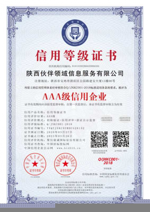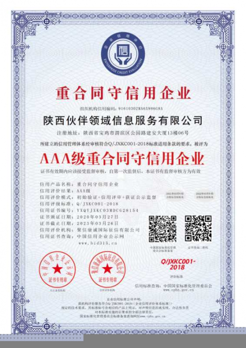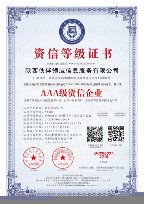疫情初过,新春盈然,万物伊始,九州复兴,伙伴领域捷报不断,继被中国爱心创业者协会授予“中国爱心创业企业”后,经中国公示网审核,中国聚信康诚国际征信有限公司审查,相关单位抽检,陕西伙伴领域信息服务有限公司荣获“AAA级诚信供应商”认证、“AAA级诚信经营示范单位”认证、“AAA级信用企业”认证、“AAA级质量服务诚信单位”认证、“AAA级重合同守信用企业”认证、“AAA级资信企业”认证、“中国诚信企业家”认证与国际同等审核双认证。