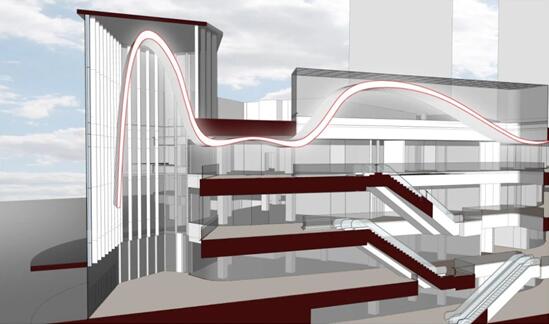 在目前商场层数越来越高的设计中有点特立独行,但是单层面积够大,即使是位于最高层的商铺人流也能得到保证。日后还有希尔顿宴会厅等餐饮,会为顶层带入巨大人流量。