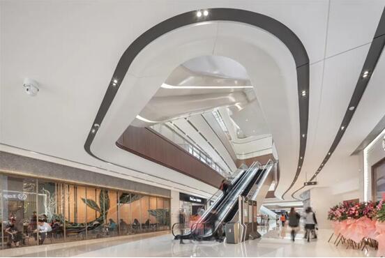 木纹中空边缘增加了空间的温暖感和突出中庭的弧线,另外天花格栅与白色造型的明暗及对比增加了天花层次感;主要的是中庭突出平台增加座位或特色流动商铺位置。