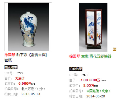 作为“青花大王”王步的第三代传人,在父辈的传授和影响下,徐老师的绘画既继承了家传,又不失自己的风格,且独创了现代装饰结合传统用笔的画法。因画牡丹传神,徐国琴老师被众多业内人士誉为“瓷坛牡丹仙子”!她出身名门,才情俱佳,被业界人士尊为“当代瓷坛的李清照”。多年来静心创作,绘画造诣颇深,获得荣耀无数。力作虽然不常出现在各大拍场,但是,拍卖成绩也是可圈可点。