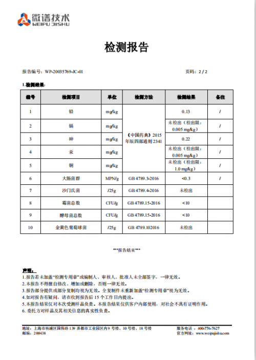 微生物监测显示:酵母菌、霉菌、沙门氏菌均达到质检标准,未检测出大肠杆菌、金黄色葡萄球菌。砷、镉、铅、汞等重金属检测均符合质检标准。