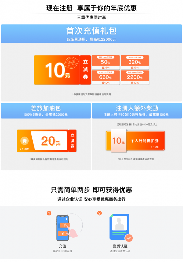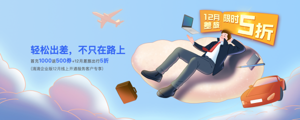 在此背景下,滴滴企业版秉持着让员工“轻松出差,不只在路上”的理念,于12月启动了针对差旅出行场景的“差补月”回馈活动:已完成充值的滴滴企业版客户,12月在差旅或接送机用车制度下的订单,可畅享100单5折优惠(每单最高抵扣20元)。不仅如此,面向在12月完成首次充值并通过资质认证的企业客户,滴滴企业版还推出了最高可返22000元券的优惠活动。