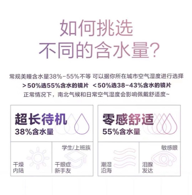 CoFANCY可糖是第一家同时出品两种含水量的美瞳品牌,尽管高含水量的镜片透氧性会更佳,但含水量越高对环境的湿润度要求更高。由于我国幅员辽阔,伴随南北跨纬度近50度,气候差异也较大,高含水量的产品适用于我国南方等湿润地区人群。而含水量较低的,眼睛不干燥,更适用于北方等干燥地区人群佩戴。同时,用户佩戴舒适度还与镜片的基弧——镜片与眼球贴合弧度有关,基弧太小对眼球产生压迫感,基弧过大则容易造成滑片,而可糖的产品设计也是基于亚洲地区人群眼球的基弧而特制。