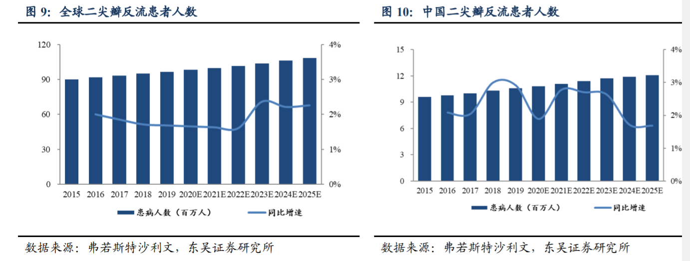 2019年国内中度以上MR人群为1680万人,假设以每年3%的速度增加,预计到2025年,全国中度以上MR患者超过2000万,其中需要手术的患者占到40%左右,手术高危人群在需要手术的患者中约占50%。
