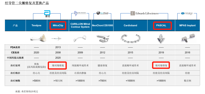 全球已经上市的二尖瓣缘对缘修复产品包括MitraClip和PASCAL,目前全球已有超10万名MR患者接受了MitraClip治疗。在国际市场上,MitraClip相对来说最为成熟。PASCAL由美国的爱德华生命科学研发,目前仅获得CE批准,其设计原理类似MitraClip。