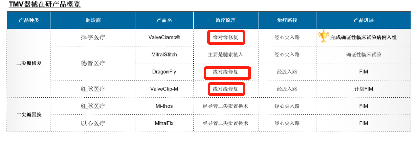 而目前中国国内共3款用于二尖瓣缘对缘修复的产品已进入上市前确证性临床阶段,分别是捍宇医疗的ValveClamp(2019年2月启动确证性临床)、德晋医疗的DragonFly(2021年5月启动确证性临床)以及纽脉医疗的ValueClip-M(2021年8月启动确证性临床)。