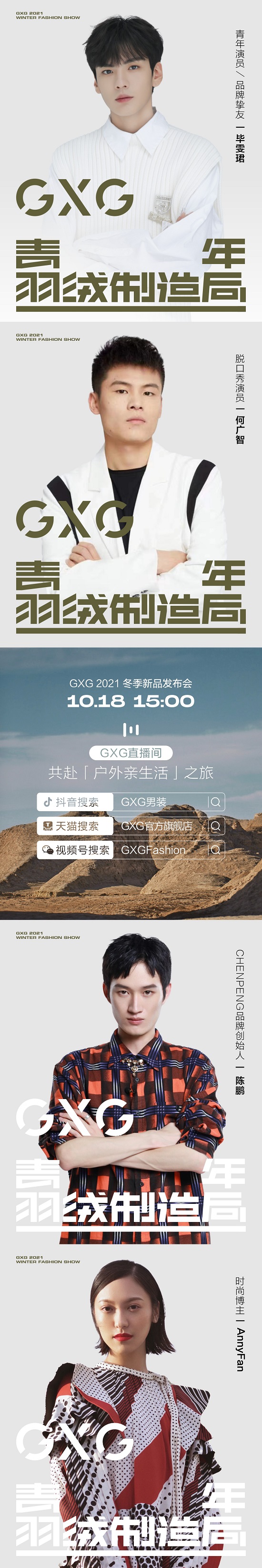 与此同时,为营造行走于自由户外的真切氛围,GXG还将首次在户外搭建“亲生活露营主题直播间”,邀请青年演员/品牌挚友毕雯珺、脱口秀新星何广智、时尚博主Anny fan与国际知名羽绒设计师陈鹏一同见证GXG冬季新品发布,不同身份的潮流代表将多角度分享试穿、推荐新品,畅谈对户外时尚的独特见解。
