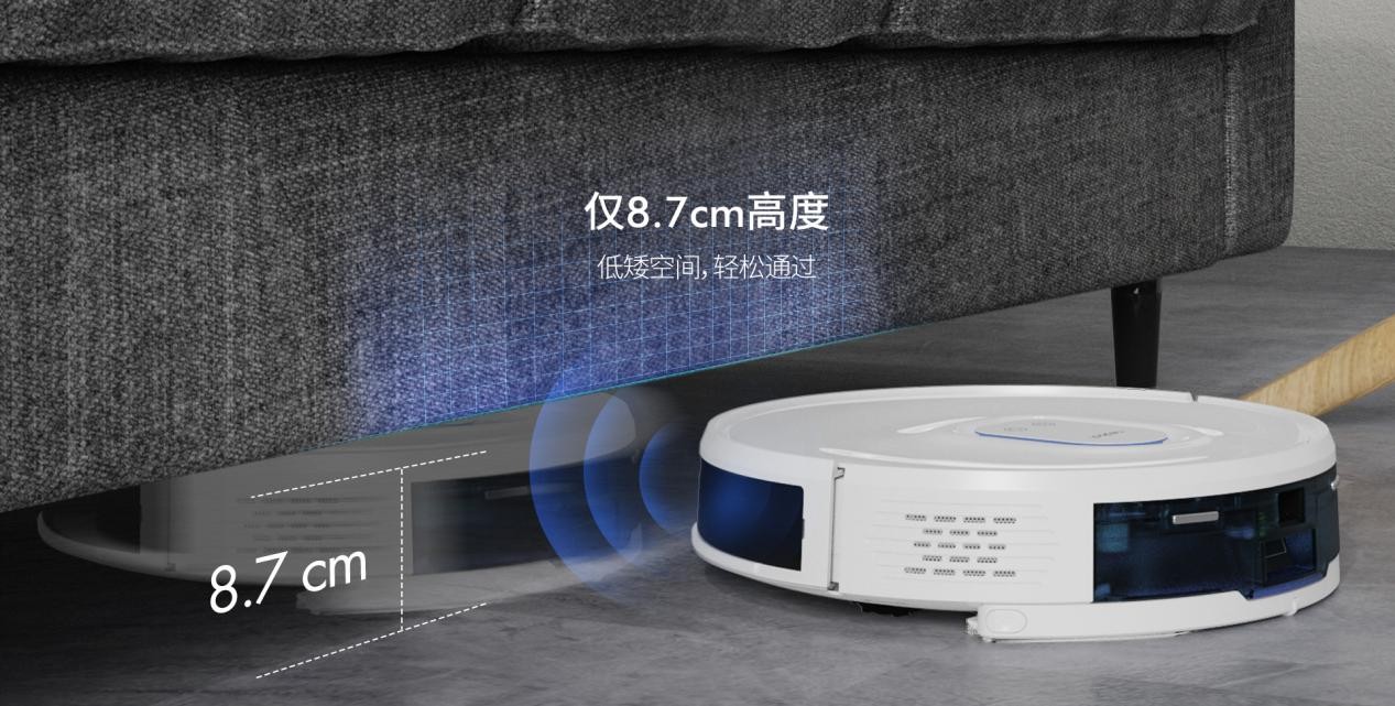 外观上,宜宝Q11的设计十分简洁,白色机身透出满满的家居感,把雷达放在机身前部的设计也强化了一体性。整体高度只有87mm,能够深入床底、沙发下等清洁死角,也极大地拓展了传统扫地机器人的清洁范围。