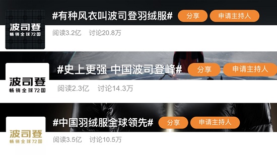 作为备受关注的“国民羽绒服”品牌,波司登首先以品质打下坚实消费者基础,今年在羽绒服领域的创新有目共睹,成为活跃在热销热议榜的“常青树”。2021年以来,波司登屡次登上热销话题榜,#有种风衣叫波司登羽绒服#话题阅读量达3.2亿,讨论量达20.8万条;#史上最强 中国波司登峰#话题阅读量达2.3亿、#中国羽绒服全球领先#话题阅读量达3.5亿,品牌在主流消费群体中的热度不减。