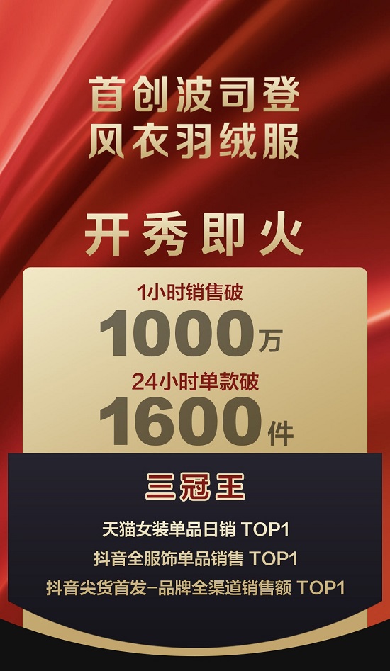 羽绒服销售旺季以来,羽绒服销量持续领先,波司登表现出色,频频霸榜,成为备受好评的国民羽绒服品牌。此前,波司登刚刚经历了双十一、双十二大促,战果斐然。根据数据统计,波司登双十二销量稳占品类前列。无独有偶,双十一促销中,波司登也收获颇丰,旗下全品牌、全渠道羽绒服GMV同比大增53%,增速远超去年同期,最终以21.8亿的销售额稳坐双十一销售冠军宝座。