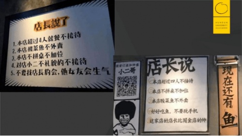 还有最为消费者津津乐道的“二文化”。比如,“门店只做一种鱼”——鲈鱼,每天限供100条,卖完拉倒;“只提供一种辣度选择——麻辣”,不能减也不能加;每单“只接待4人以下用餐”,人多请出门,这些看起来很奇葩的、不把消费者当上帝的规定,在餐饮行业里显得是那么与众不同。这就是定位专家顾均辉授课时屡次提及的:全行业向左,我向右。太二既带给了消费者别样的体验,又因此形成了标准化流程,提高了翻台率,可谓一举多得。
