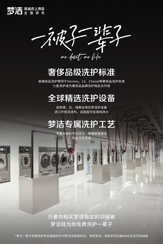 梦洁以消费者需求为核心,不只是一句口号,而是实实在在地把高端服务做到极致。梦洁以Hermès、LV、CHANEL等奢品洗护标准为目标,重磅打造七星奢品洗护标准,全力保障梦洁洗护质量。与此同时,梦洁还采用德国、瑞典、日本等全球顶级洗护设备,同时使用进口洗涤剂和远超国家直饮标准的纯净水,最大可能减轻洗护设备对洗护产品的伤害,延长床品使用寿命,让高端床品洁净如新。
