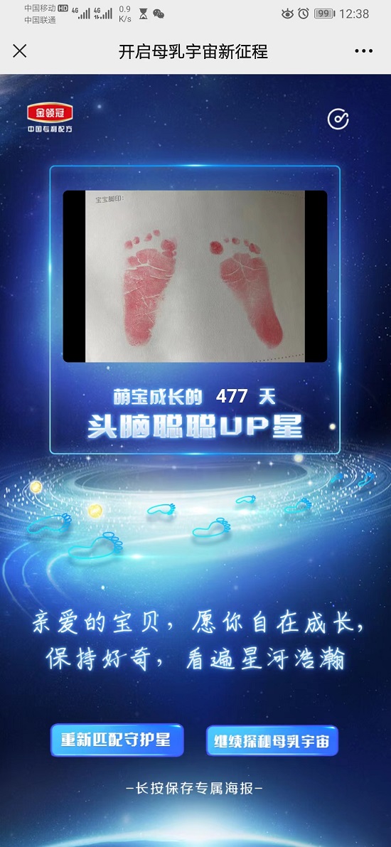 5月7日至20日期间,网友们通过金领冠官方微信、微博发布的H5.上传宝宝出生脚印照,就有机会收获来自“母乳宇宙”的赠礼——由伊利金领冠特邀艺术家以宝宝脚印为素材创作的“母乳研究20年数字藏品”。
