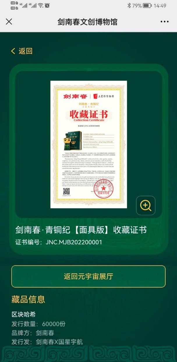 众所周知,剑南春每次发布限量产品都会给用户发放一本专属的纸质证书,使得产品更具收藏价值,值得一提的是,本次剑南春不仅仅有纸质证书,瓶身还有对应编码,扫描纸质证书上的二维码就可查询相应的电子证书,电子证书在剑南春区块链与ADASpace卫星链上都有唯一标识,保证了证书的唯一性和不可篡改性,更彰显了这款文创联名酒的稀缺珍贵属性。