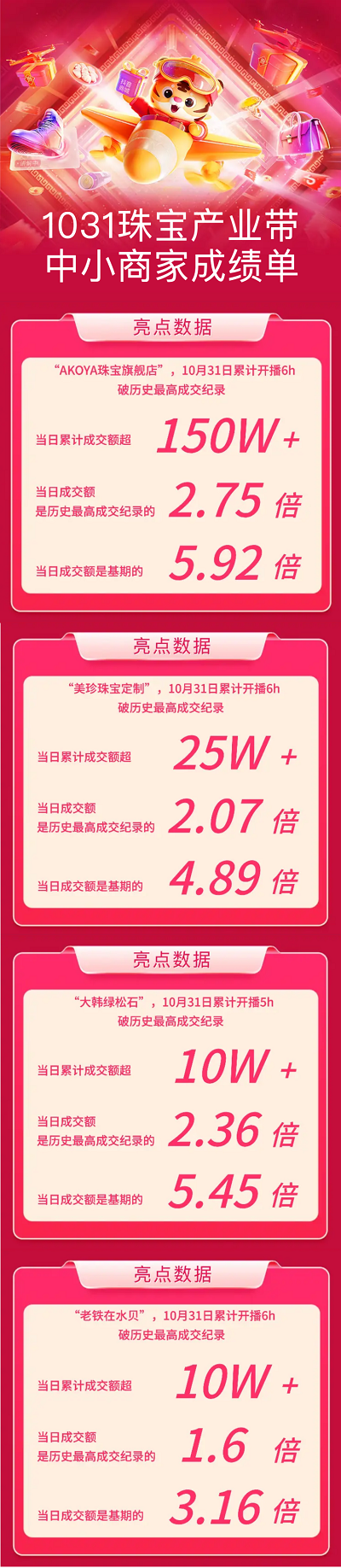 AYOKA珠宝旗舰店是本次参与活动的珠宝产业带中小商家之一。活动首日AYOKA累计开播6小时,破历史最高成交记录,当日累计成交额超150万,是历史最高成交记录的2.75倍。同时AYOKA也成为珠宝产业带中小商家业绩贡献top1.