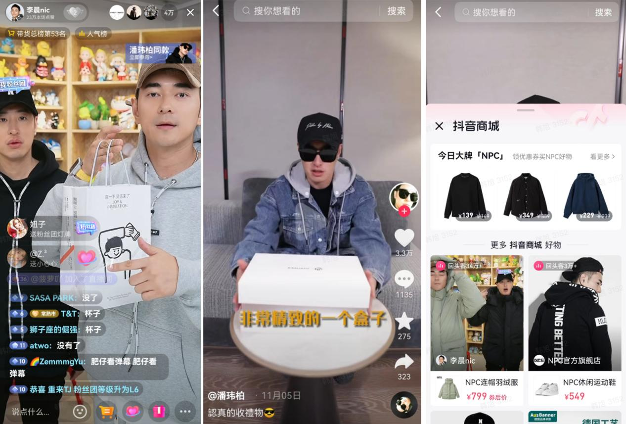 在抖音双11好物节期间,NPC联手潮鞋品牌Kaalixto推出联名新品,并举办线下快闪店为新品发售预热。NPC挖掘特色短视频和直播玩法:NPC创始人潘玮柏拍摄联名款星星鞋开箱等短视频,并通过短视频锚点引流货架场景;官方旗舰店、李晨nic和旗舰店三大直播间实现“多屏共振”,期间创始人潘玮柏和李晨现身直播间,为新款进行预热宣传。