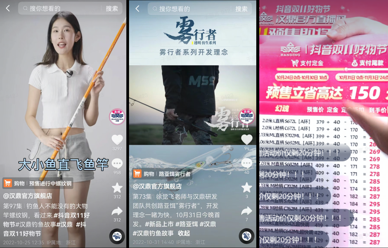 再比如,渔具品牌汉鼎在预售期,通过官方及矩阵账号短视频同步曝光种草,利用短视频互动有奖等玩法,提升了短视频传播率,并在直播间锚定价格,吸引用户提前预约。