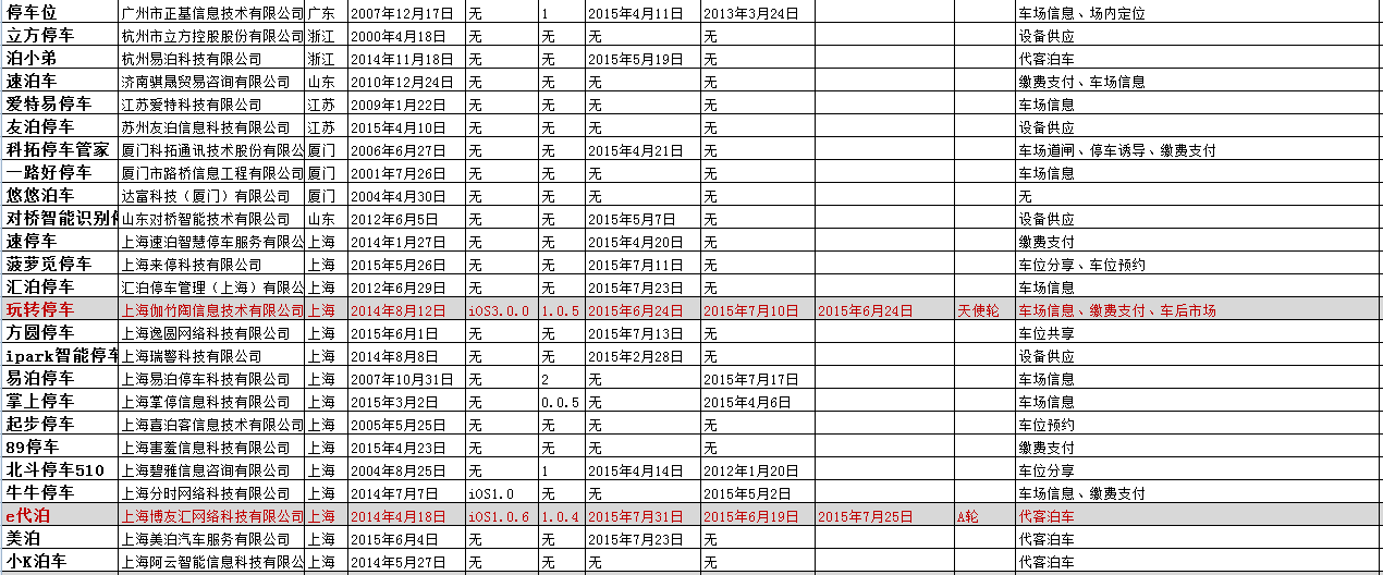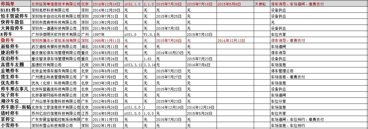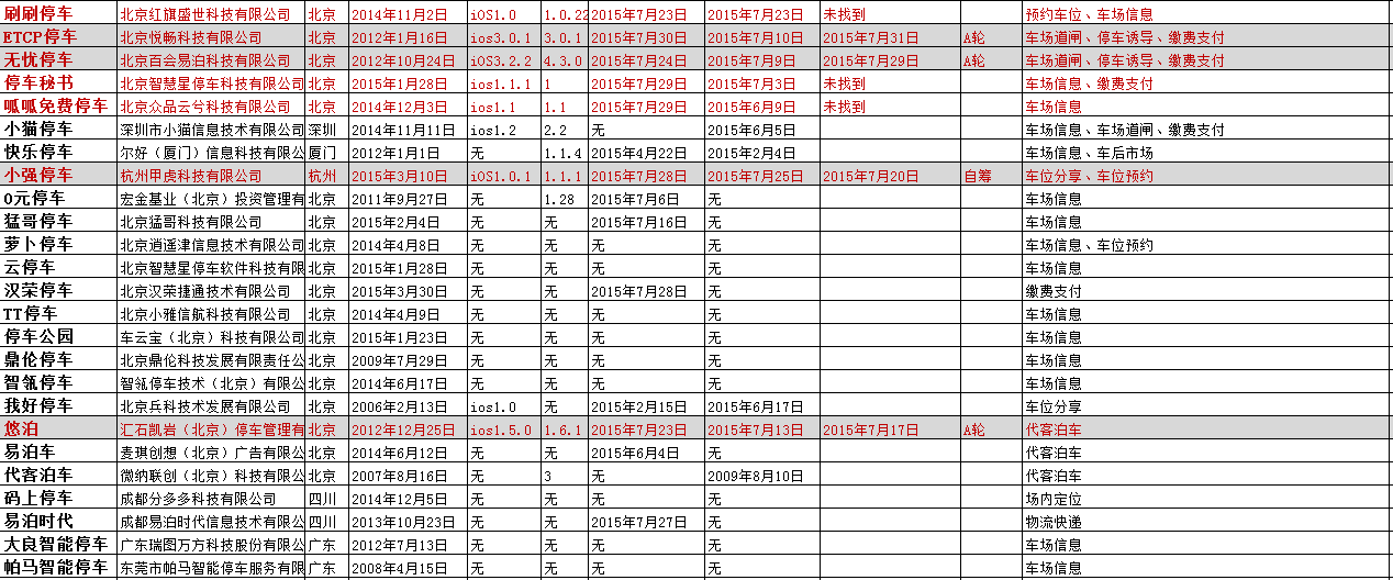 后续我们会根据手机APP端的上线时间,软件的版本更新频次,以及各家APP的iOS版本及Android版本的开发情况进行比对筛选,从百家停车公司中挑选出一些“入围选手”。