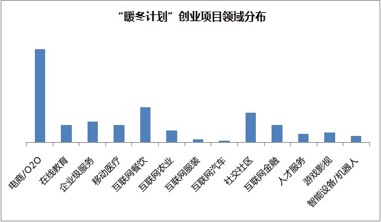 2015年资本遭遇寒冬,受挫最严重的当属O2O领域,一大批创业公司接连倒闭。但从“暖冬计划”的参与情况来看,创业者最热衷的创业领域依然是电商020,且主要集中在母婴、社区、生鲜、超市、宠物、旅游等方面。