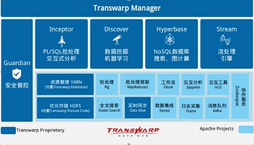 不仅是数据挖掘,星环提供的本质是工具。如Hadoop生态中的HDFS、MapReduce、Hive、HBase、YARN、ZooKeeper、Spark等,星环就是在开源的基础上改造这些组件,将不稳定的部分改稳定,将性能低下的部分提升性能,提供支持SQL标准的接口,方便传统RDBS的业务往产品TDH(Transwarp Data Hub)上转移,等等,最终打造一站式平台。TDH由四部分组成, 包括Transwarp Hadoop基础版、Transwarp Inceptor交互式分析引擎、Transwarp Hyperbase实时数据库和Transwarp Stream流处理引擎。如下图所示: