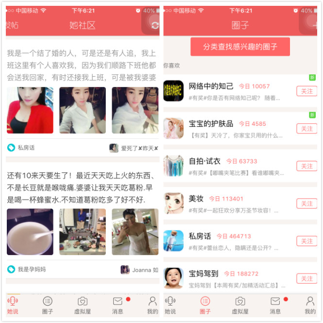 许多纯粹移动端的产品,囿于4-5寸的手机屏幕,都选择“小而美”的垂直路线,但是她社区一上来就是奔着平台级产品去的。她社区坚持做社区平台,在话题和人群上不聚焦,在业务上聚焦出产好内容。