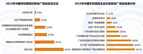 iiMedia Research(艾媒咨询)数据显示,63.5%的中国手机网民很少主动点击移动广告,但仍有43.1%的用户愿意参与步骤简单的广告互动。广告形式的互动性,广告内容的个性化和可分享功能是吸引手机网民主动点击移动广告的主要因素;互动分享(39.1%)、定向推送(35.3%)和短视频广告(29.3%)是中国手机网民较为感兴趣的移动广告形式。