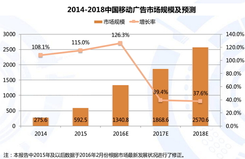 iiMedia Research(艾媒咨询)数据显示,从2014年起,移动广告市场增速均保持在100%以上,2015年市场规模达592.5亿元。预计2018年中国移动广告市场规模将超过2500亿元。移动广告市场中短、彩信广告占比逐年下降,预测到2018年仅剩1.5%,短、彩信广告将逐渐退出舞台。另一方面,移动搜索广告和APP广告发展迅猛,艾媒咨询分析师预测,到2018年,移动广告市场将主要由APP广告(40.9%)和移动搜索广告(37.6%)构成。