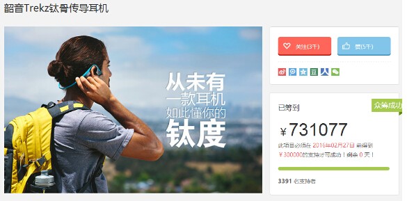 近日,备受投资界关注的AfterShokz Trekz钛骨导耳机如预期所料,在京东完成众筹并大获成功,众筹率高达200%以上,超过三千位运动爱好者、跑友以及数码发烧友参与此次众筹。本次众筹也是Af