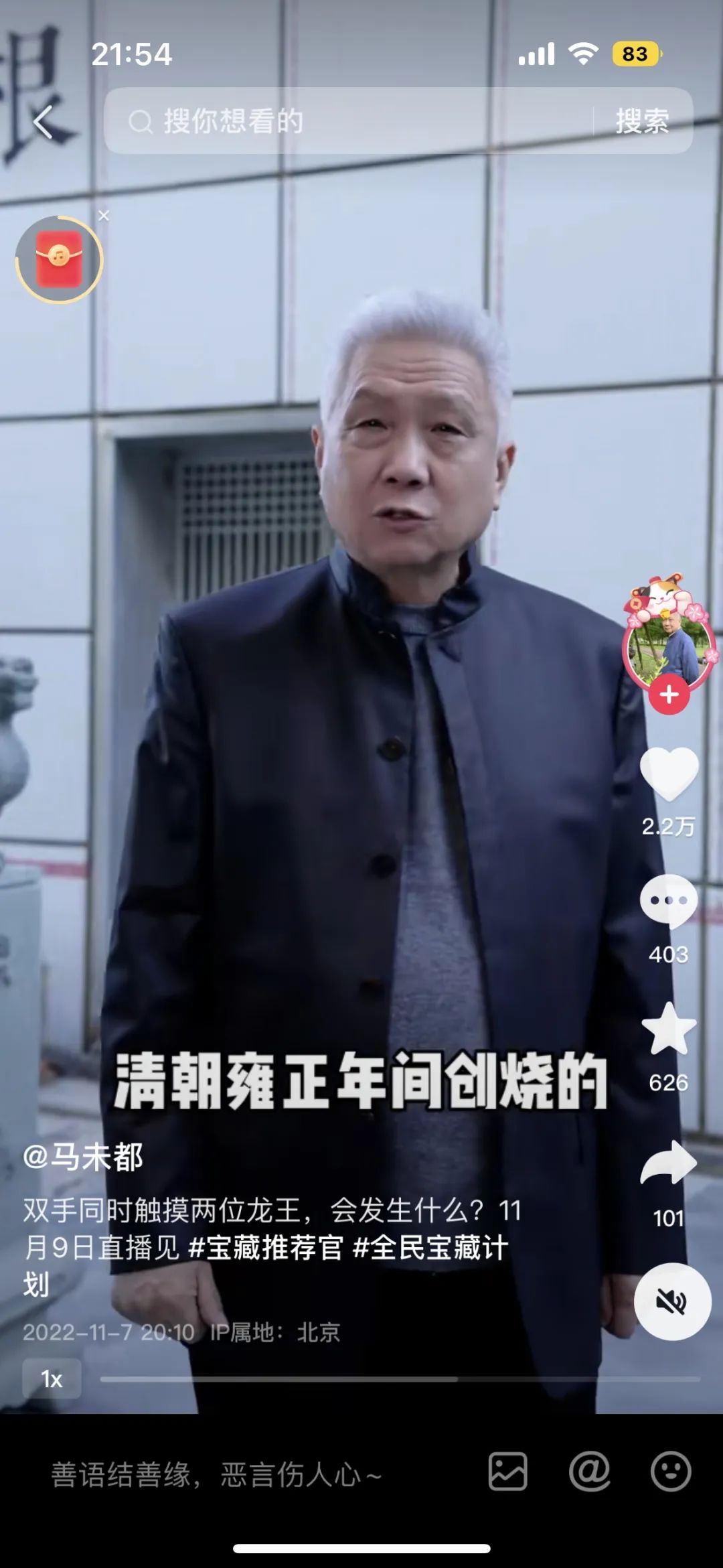 11月9日,“马未都双十一粉丝福利大放送”专场活动在抖音电商平台全面开启。文玩品质保障再升级,背后的传统故事和品鉴方式不断被释出,助推马未都粉丝量突破1000万大关,相关热度引发众多商家、达人跟进