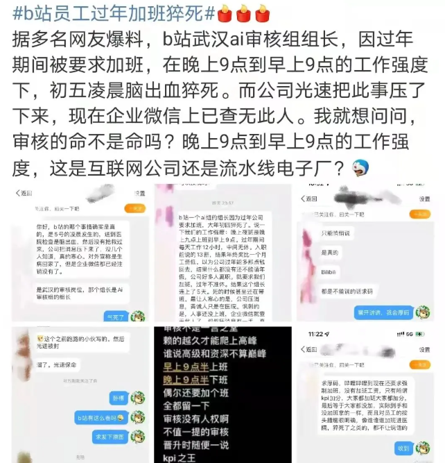 2月7日,有网友在微博爆料称视频网站哔哩哔哩武汉AI审核组组长疑似春节加班期间猝死。2月8日晚,B站官方微博账号对相关网传情况作出回应,否认了猝死与加班的关系。B站官方回应中称,2月4日下午该司内