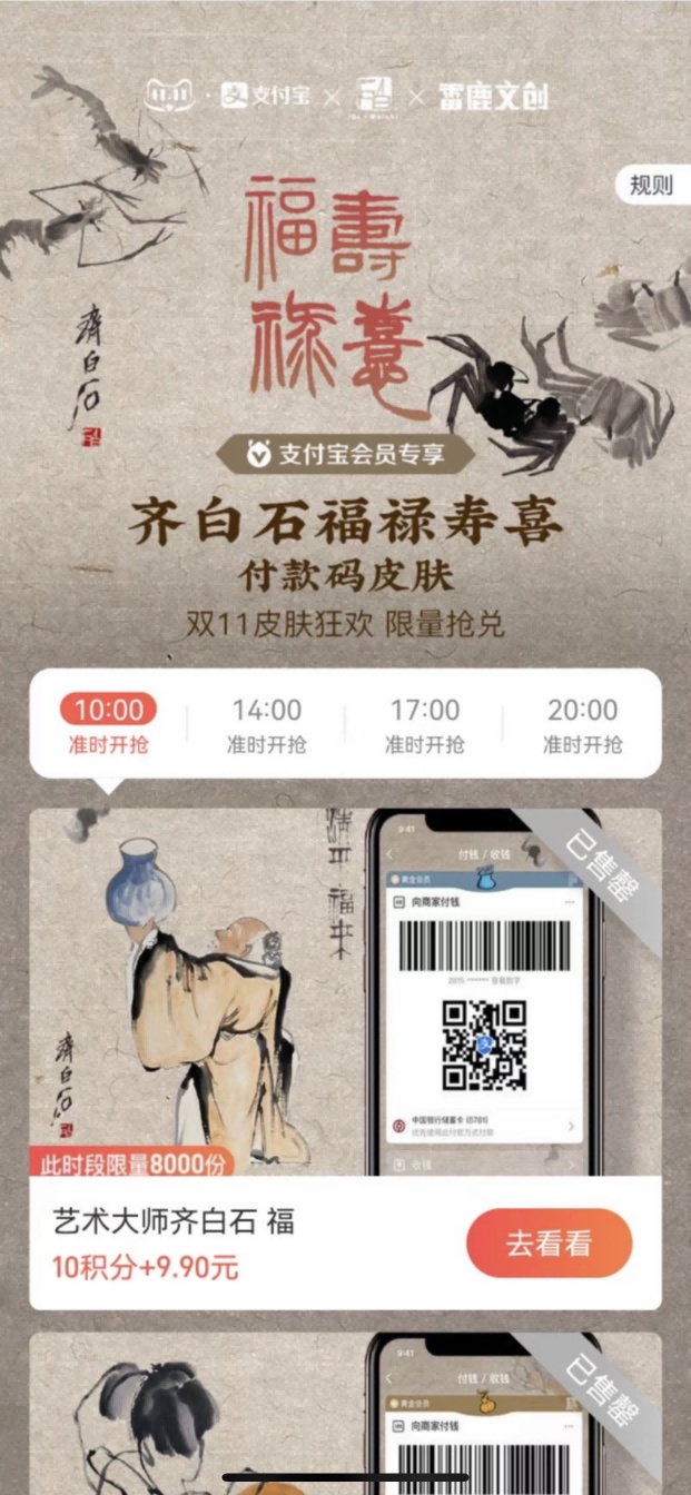 近日,雷鹿文创联合国际艺术授权基金,发行艺术大师齐白石-福禄寿喜主题支付宝付款码皮肤。该主题付款码皮肤基于齐白石的四幅名画制作而成,将作为数字艺术品永久存在于蚂蚁链上。 众所周知,齐白石是近现