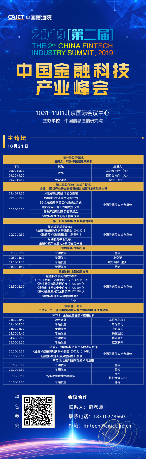 2019(第二届)中国金融科技产业峰会将于2019年10月31日上午9点在北京国际会议中心拉开帷幕。届时,中国信息通信研究院(以下简称“信通院”)将广泛联合金融科技产业生态各方齐聚2019(第二届