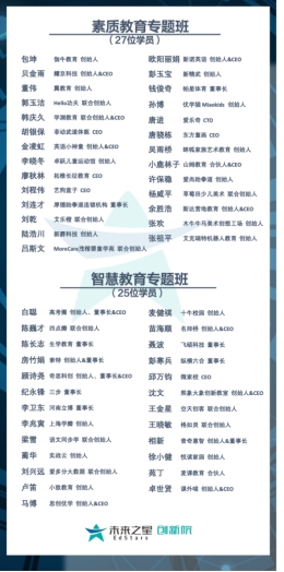 近日,未来之星旗下全新课程产品“未来之星创新院”完成首期招募,共有52位学员优秀教育创业者入选。他们将分成素质教育专题班和智慧教育专题班2大专题班,进行近一年的专业学习。创新院将促进学员相互合作交