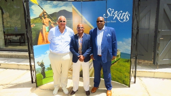 圣基茨和尼维斯总理(右)和旅游部长林赛·格兰特(中)欢迎MSR传媒制片人菲利普·马丁内斯(左)到访圣基茨